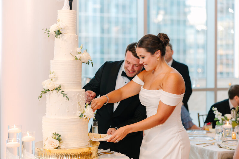 Cake cutting followed by bouquet toss.